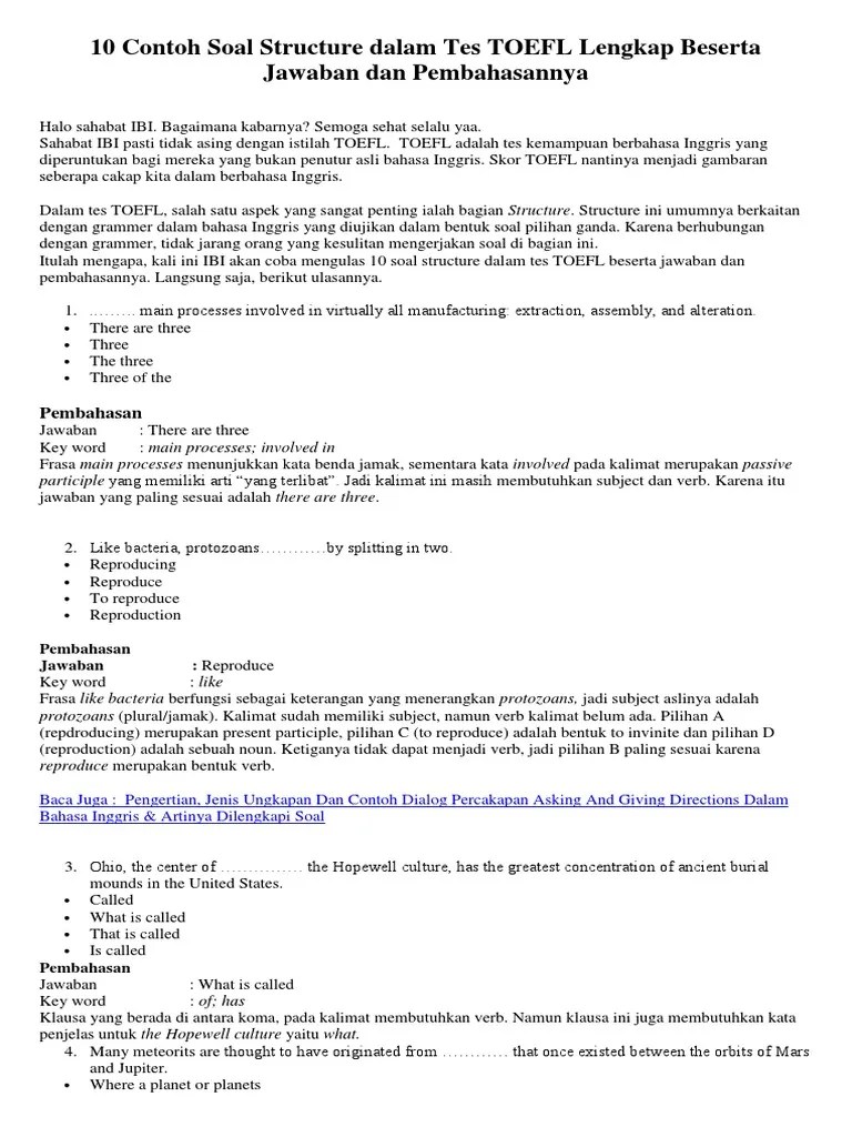 48+ Contoh Soal Toefl Pilihan Ganda. Pilihan (a) (to being) salah . Structure ini umumnya berkaitan dengan grammer dalam bahasa inggris yang diujikan dalam bentuk soal pilihan ganda. Soal soal structure toefl, toefl structure ,download toefl structure gratis,. Karena berhubungan dengan grammer, tidak jarang orang . Latihan soal verb dan jawabannya: Yuk belajar 12+ kumpulan soal toefl structure dan pembahasan setiap latihan terdiri dari 10 soal pilihan ganda. Contoh soal pilihan ganda visual basic. Biasanya dalam test toefl anda . Dari keempat jawaban, kata/frasa yang paling memungkinkan untuk mengikuti intent adalah "on being". Di bawah ini adalah contoh soal structure and written expression.