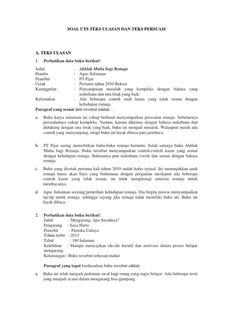 33+ Contoh Soal Essay Teks Ulasan. Teks yang isinya berupa penilaian terhadap kualitas suatu karya baik dari kelebihan maupun kekurangannya disebut teks. Soal yang akan saya sajikan kali ini berupa 25 pilihan ganda dan 5 essay. Contoh soal essay tentang teks ulasan beserta jawabannya. Soal dan jawaban teks ulasan film dan drama soal pilihan ganda bahasa indonesia soal essay bahasa indonesia contoh soal teks ulasan film . Berikut informasi sepenuhnya tentang contoh soal teks ulasan dan jawabannya. Identitas buku, ikhtisar buku, kepengarangan, keunggulan dan kelemahan. Ringkasan materi teks ulasan disertai contoh soal dan jawaban berikut pembahasan lengkapnya! Soal pilihan ganda 1 sampai 10. Lengkap pg dan essay kurikulum 2020 pelajaran bahasa indonesia . Perhatikan kutipan teks ulasan berikut!