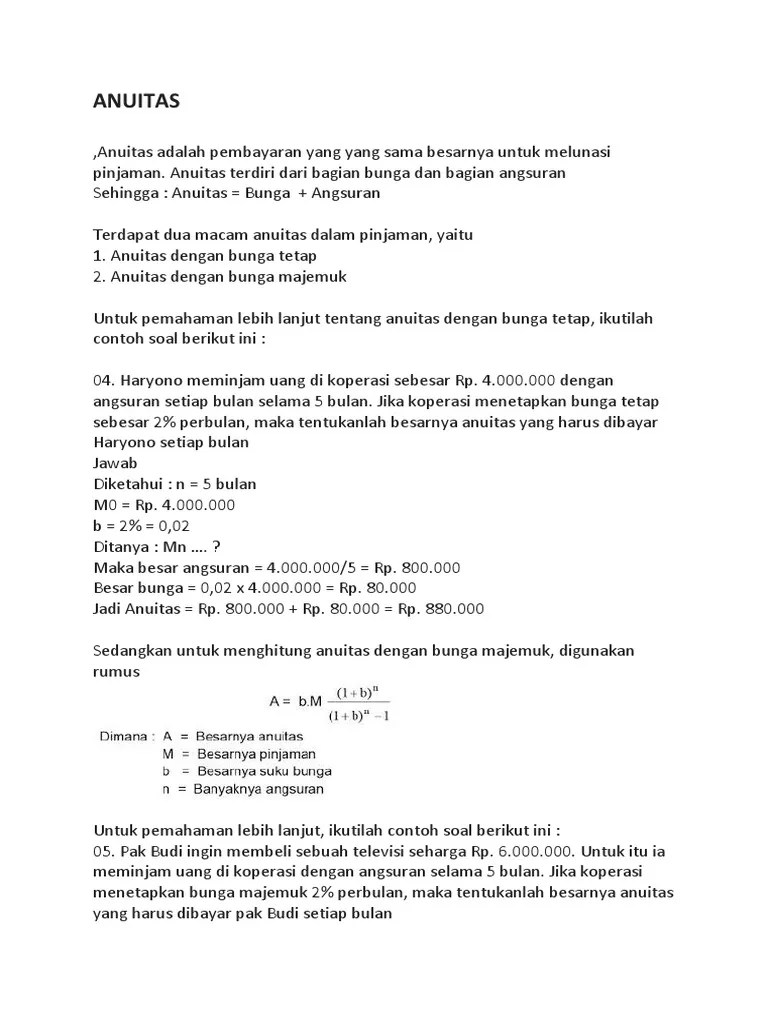 30+ Contoh Soal Sisa Pinjaman Anuitas. Sebuah pinjaman akan segera di lunasi dengan sistem anuitas bulanan. Contoh soal sisa pinjaman anuitas. Jika besar dari angsuran rp. M = besar pinjaman a1= angsuran tahun pertama. Suatu pinjaman sebesar rp6.500.000,00 akan dilunasi dengan anuitas bulanan dengan suku bunga majemuk 2 % 2 \% 2% per bulan. 85.000, dan bunganya sebesar rp. Pinjaman sebesar rp10.000.000,00 akan dilunasi dengan sistem anuitas bulanan dengan suku bunga 3%/bulan selama 2,5 tahun. Contoh soal sisa pinjaman : Anuitas adalah sejumlah pembayaran pinjaman yang sama besarnya untuk setiap jangka waktu tertentu yang terdiri atas bagian bunga dan bagian . Jika sisa pinjaman akhir bulan .