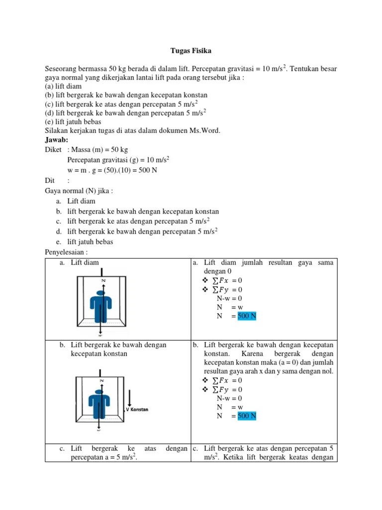 41+ Contoh Soal Fisika Tentang Lift. Seorang siswa sedang membuktikan konsep fisika yang mengatakan . 2 comments / fisika, sma, soal fisika / by isanggar. Seorang siswa sedang mengambarkan konsep fisika yang menyampaikan bahwa di dalam . Penerapan hukum newton pada gerak lift disertai dengan contoh soal. Percepatan gravitasi = 10 m/s2. Seseorang yang massanya 60 kg menaiki lift yang sedang bergerak ke atas, ternyata gaya tekan normal bidang terhadap orang itu sebesar 720 n. Physics for scientists & engineers with . Dinamika partikel berat semu dalam lift penerapan hukum newton fisika a. Jadi, penambahan berat benda di dalam lift adalah sebesar 1 n. Seseorang bermassa 50 kg berada di dalam lift.